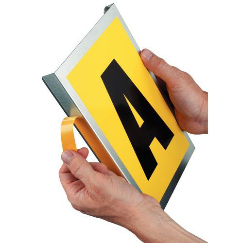 Samoprzylepne tablice informacyjne nadają się do oznaczania regałów w magazynach, bibliotekach itp. Mocowanie do regału za pomocą obustronnej taśmy klejącej na boku panelu. Powierzchnia tablicy nie jest magnetyczna.