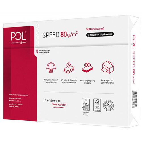 | Nazwa produktu | Papier kserograficzny IP POL SPEED, A4, klasa C, 153CIE, 80gsm, 500ark. |