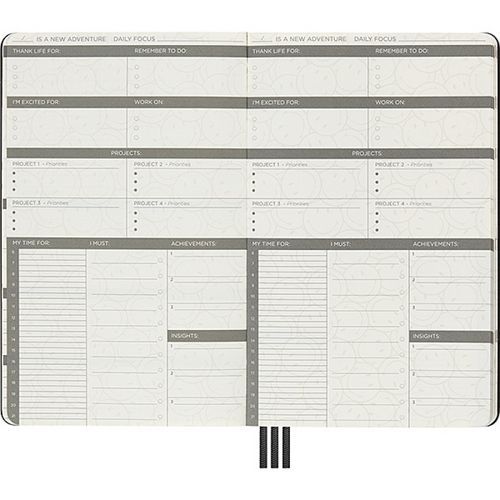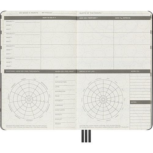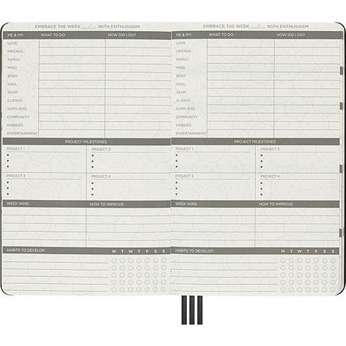 Planer zapewnia miejsce, którego potrzebujesz, aby zatrzymać się i zastanowić dzięki miesięcznym, tygodniowym i dziennym sekcjom, które poprowadzą Cię przez Twoje projekty, cele i nawyki: