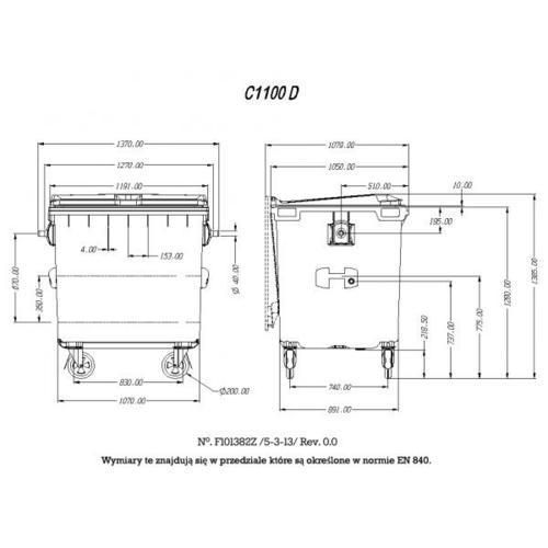Pojemniki na odpady o pojemności 1100 l z płaską pokrywą, zamykaną od góry. Cztery kółka obrotowe ułatwiają manewrowanie. Wykonany z tworzywa sztucznego o wysokiej gęstości polietylenu, odporny na działanie promieni UV, wody, roztworów kwaśnych i alkalicznych, grzybów, bakterii, detergentów.