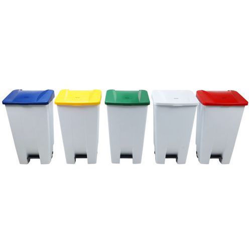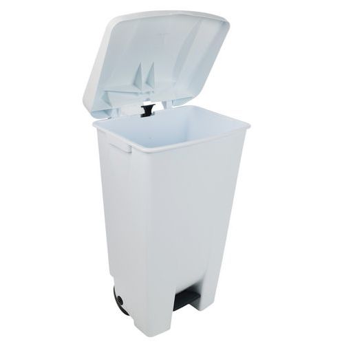 Plastikowe kosze na śmieci z kolorowymi pokrywami, do użytku w pomieszczeniach zakładów spożywczych. Kosze posiadają dwa kółka i uchwyt na tylnej stronie. Higieniczne otwieranie pokrywa dzięki systemowi pedałowemu na przedniej stronie kosza.