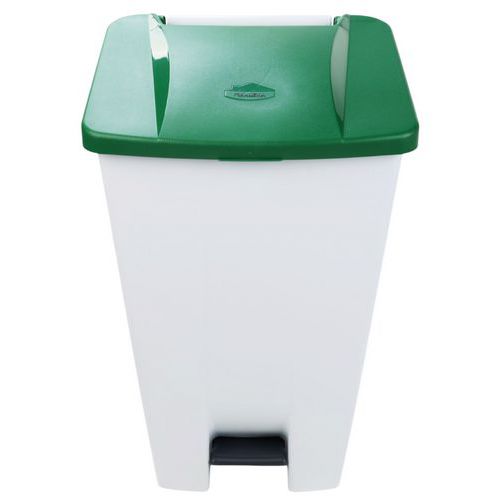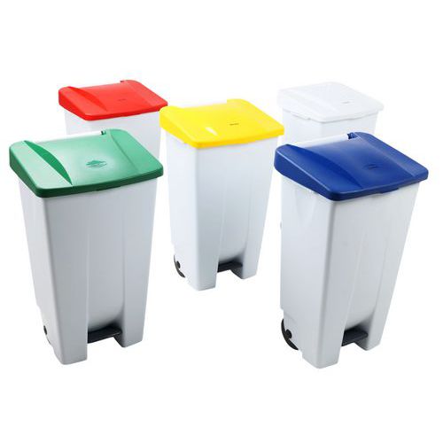 Plastikowe kosze na śmieci z kolorowymi pokrywami, do użytku w pomieszczeniach zakładów spożywczych. Kosze posiadają dwa kółka i uchwyt na tylnej stronie. Higieniczne otwieranie pokrywa dzięki systemowi pedałowemu na przedniej stronie kosza.