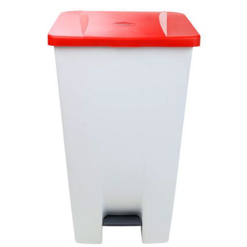 Plastikowe kosze na śmieci z kolorowymi pokrywami, do użytku w pomieszczeniach zakładów spożywczych. Kosze posiadają dwa kółka i uchwyt na tylnej stronie. Higieniczne otwieranie pokrywa dzięki systemowi pedałowemu na przedniej stronie kosza.