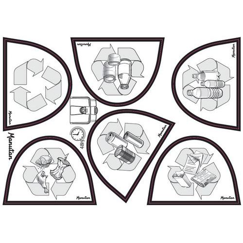 W zestawie naklejki samoprzylepne do oznaczania koszy na odpady segregowane.