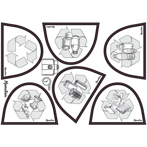 W zestawie naklejki samoprzylepne do oznaczania koszy na odpady segregowane.