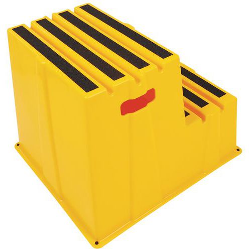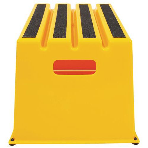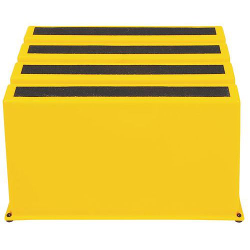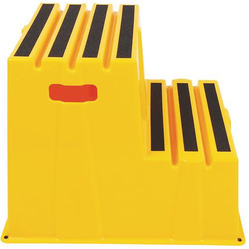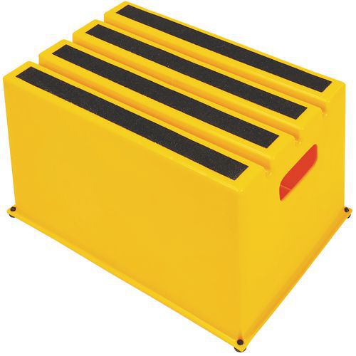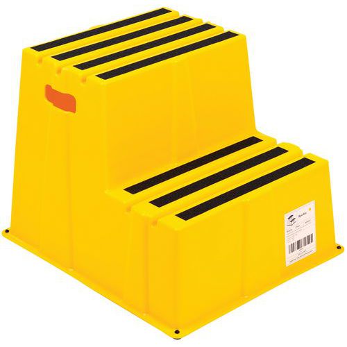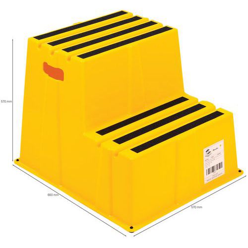 Szerokie podesty robocze z gumowymi stopkami zapewniającymi lepszą stabilność. Stopnie posiadają paski ścierne obniżające ryzyko upadku z podestu. Łatwe przemieszczanie dzięki niskiej wadze i zaczepom bocznym.