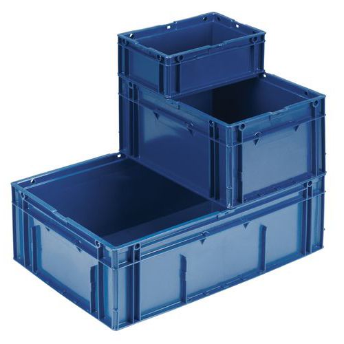Polipropylenowe pojemniki transportowe z możliwością sztaplowania i pełnym dnem oraz ścianami są kompatybilne z europaletami. Zamknięte uchwyty ułatwiające manewrowanie. Wysoka stabilność w przypadku sztaplowania. Odporne na działanie olejów, tłuszczów i wielu rodzajów substancji chemicznych. Nadają się do różnych środowisk oraz warunków klimatycznych (np. przemysł spożywczy).