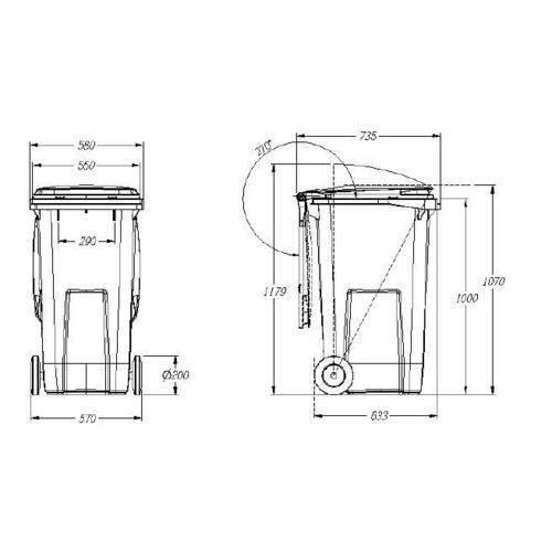 Mobilne plastikowe kontenery na odpady segregowane, z kółkami ułatwiającymi przemieszczanie. Różnokolorowe pokrywy. Wykonane z polietylenu wysokiej gęstości. Odporny na działanie promieni UV, deszczu oraz roztworów kwaśnych i alkalicznych.