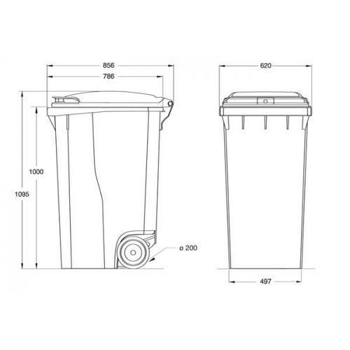 Mobilne plastikowe kontenery na odpady segregowane, z kółkami ułatwiającymi przemieszczanie. Różnokolorowe pokrywy. Wykonane z polietylenu wysokiej gęstości. Odporny na działanie promieni UV, deszczu oraz roztworów kwaśnych i alkalicznych.