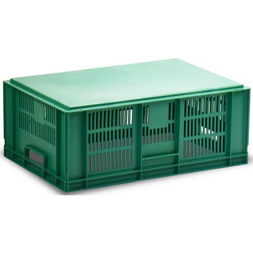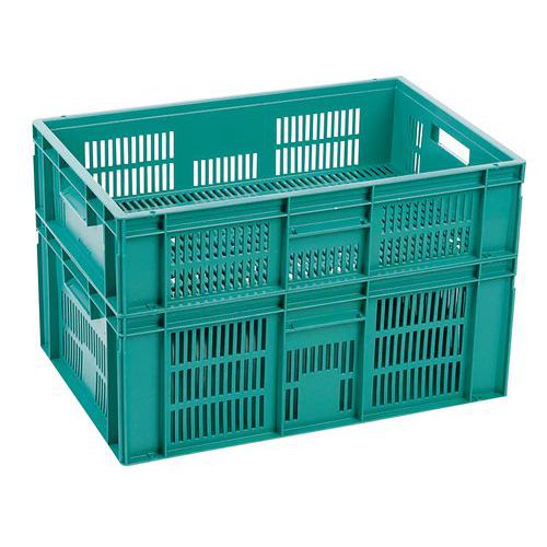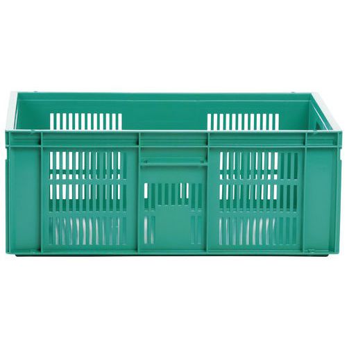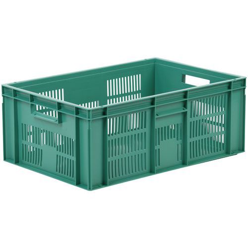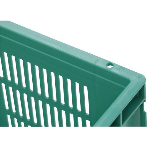 Bardzo wytrzymałe skrzynki plastikowe do układania w stosy w kolorze zielonym. Perforowane ściany boczne skrzynki. Wysoka stabilność podczas układania w stosy dzięki wzmocnionym krawędziom.