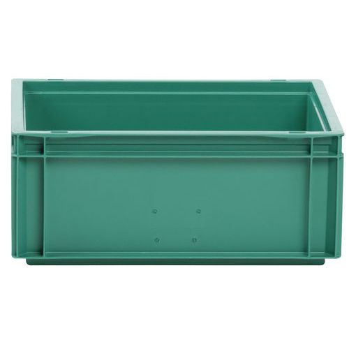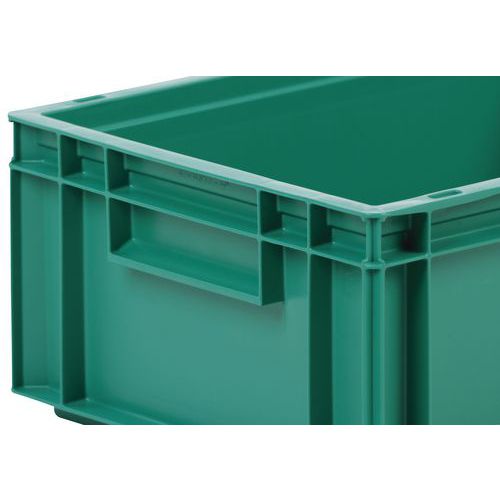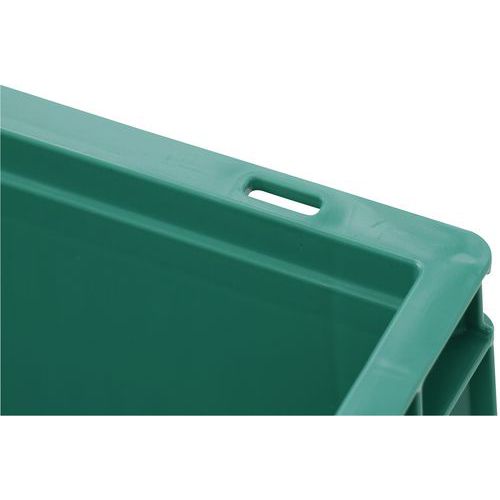 Bardzo wytrzymałe skrzynki plastikowe do układania w stosy w kolorze zielonym. Wysoka stabilność podczas układania w stosy dzięki wzmocnionym krawędziom.