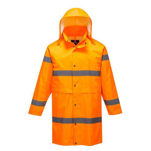 Zaprojektowana tak aby zapewnić pełną ochronę. Płaszcz gwarantuje widoczność bezpieczeństwo i ochronę przed deszczem. Płaszcz zapinany na zamek przykryty klapą z napami. Dwie obszerne przednie kieszenie na przechowywanie oraz odpowietrznik z tyłu na wysokości ramion. Rolowany kaptur. Pod pachami oczka wentylacyjne dla zwiększenia oddychalności.