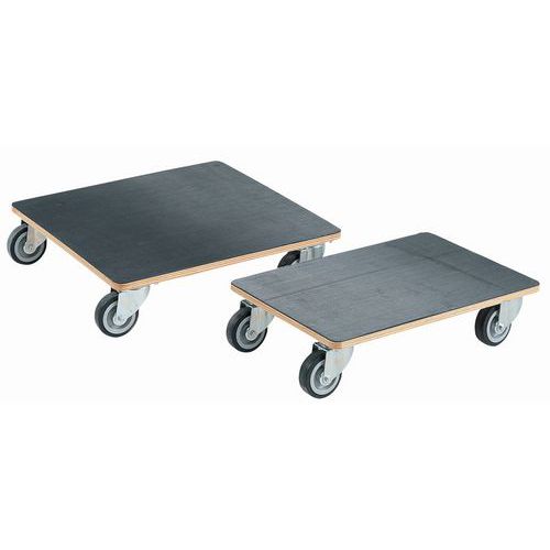 - Mobilne platformy transportowe z powierzchnią ładunkową pokrytą antypoślizgową gumową powłoką. Zaokrąglone krawędzie na wszystkich rogach zapewniają większe bezpieczeństwo. Cztery obrotowe kółka z niebrudzącej gumy zapewniają łatwe manewrowanie.