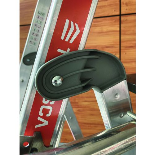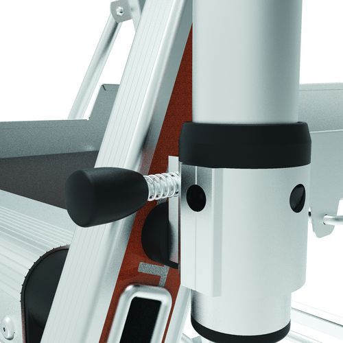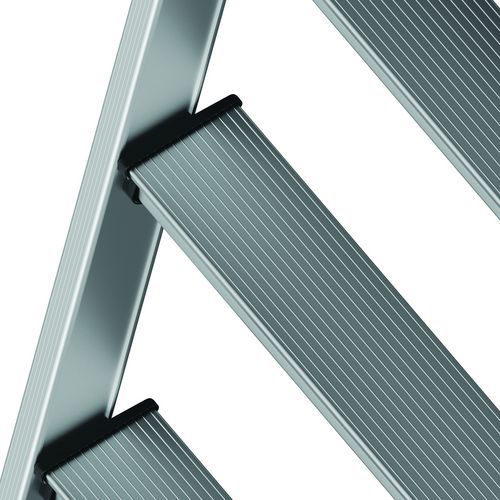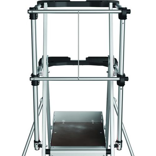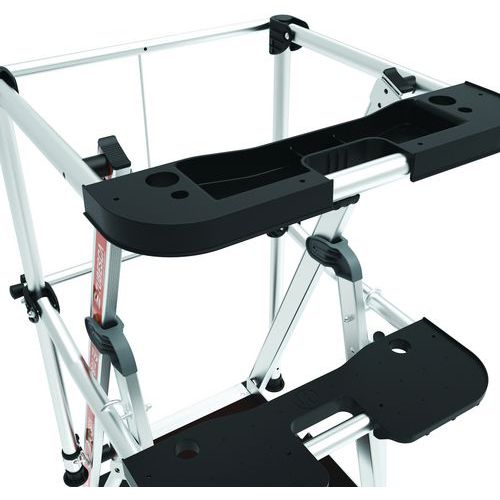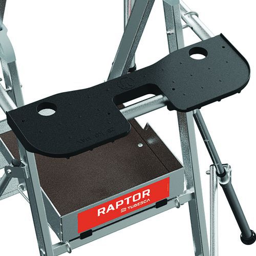 Podwójne platformy półkowe Raptor. Stała, 4-stronna balustrada z listwami zabezpieczającymi przed upadkiem i półautomatycznym systemem zamykania. Antypoślizgowe stopnie szerokości 80 mm. Zdejmowany uchwyt na narzędzia z przegródkami o udźwigu 25 kg, zintegrowane haki o maksymalnym udźwigu 10 kg. Podest antypoślizgowy o wymiarach 500 x 400 mm z ekologicznego drewna. Ergonomiczna przestrzeń robocza. Regulowane stabilizatory wysuwane z dokładnością do milimetra.