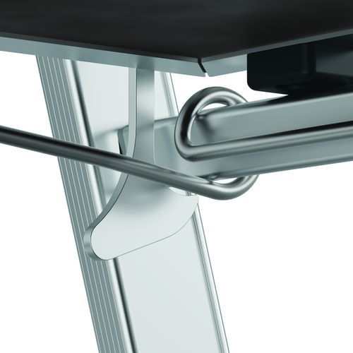 Podwójne platformy półkowe Raptor. Stała, 4-stronna balustrada z listwami zabezpieczającymi przed upadkiem i półautomatycznym systemem zamykania. Antypoślizgowe stopnie szerokości 80 mm. Zdejmowany uchwyt na narzędzia z przegródkami o udźwigu 25 kg, zintegrowane haki o maksymalnym udźwigu 10 kg. Podest antypoślizgowy o wymiarach 500 x 400 mm z ekologicznego drewna. Ergonomiczna przestrzeń robocza. Regulowane stabilizatory wysuwane z dokładnością do milimetra. Maks. obciążenie (kg) : 150 kg