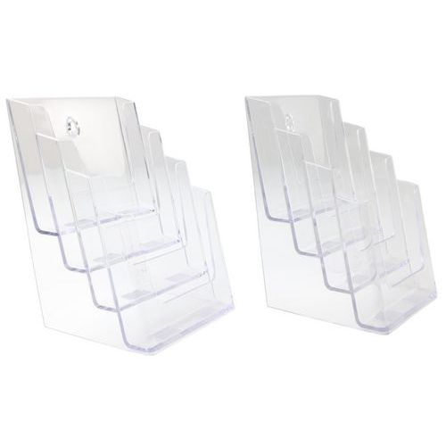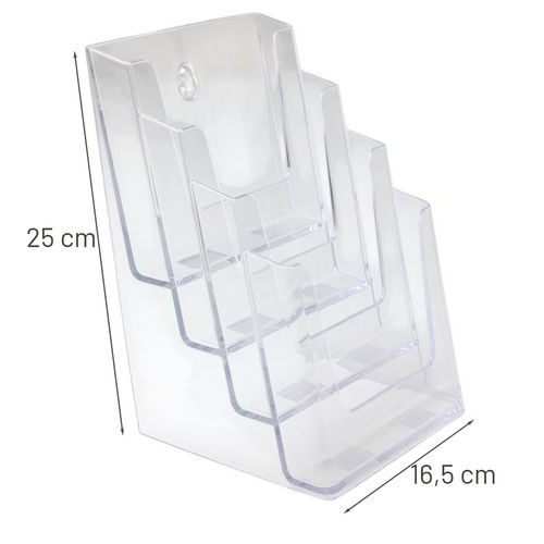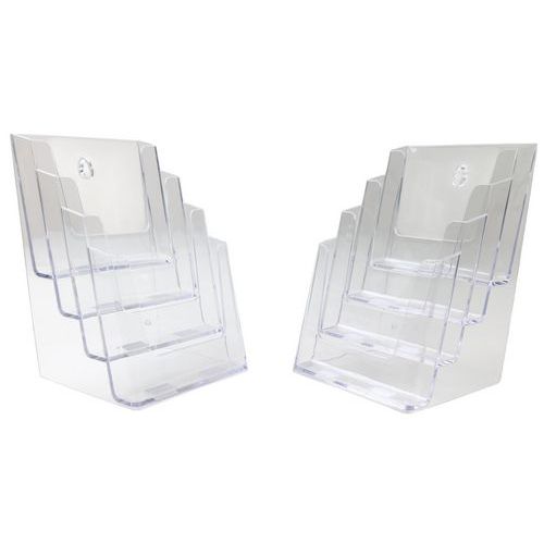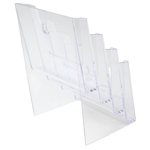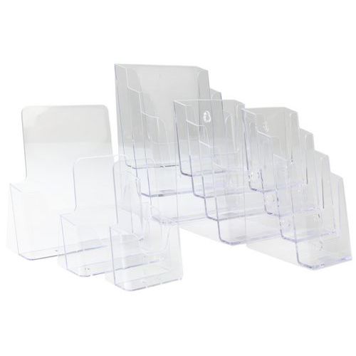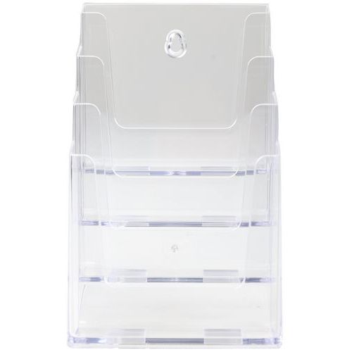 Stojaki pulpitowe do umieszczenia ulotek, broszur reklamowych i innych materiałów promocyjnych. Trzy kieszenie w stopniach za sobą, na różne formaty. Orientacja pionowa.