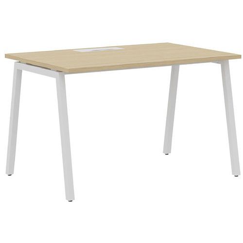 - Biurka Manutan Expert z blatem z płyty melaminowej o grubości 25 mm i metalową podstawą.