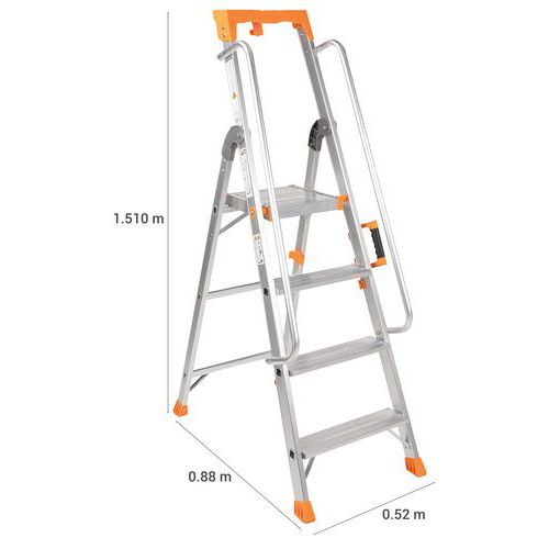 Profesjonalne drabiny aluminiowe. Zawiera wielofunkcyjną plastikową półkę z haczykiem na narzędzia. Poręcze po obu stronach dla zwiększenia bezpieczeństwa. Wzmocniona aluminiowa rama. Antypoślizgowe stopki. Łatwa do przenoszenia i przechowywania.