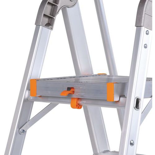 Profesjonalne drabiny aluminiowe. Zawiera wielofunkcyjną plastikową półkę z haczykiem na narzędzia. Poręcze po obu stronach dla zwiększenia bezpieczeństwa. Wzmocniona aluminiowa rama. Antypoślizgowe stopki. Łatwa do przenoszenia i przechowywania.