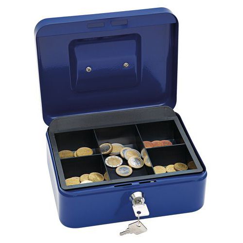 - Wykonana z grubej stali spawanej. Wytrzymały zamek, w zestawie 2 klucze. Wyciągany plastikowy zasobnik na monety. Uchwyt ułatwiający przenoszenie, wewnątrz praktyczna metalowa klamra do przechowywania np. wyciągów z bankomatów, rachunków itp. Dostępna w kolorze niebieskim.