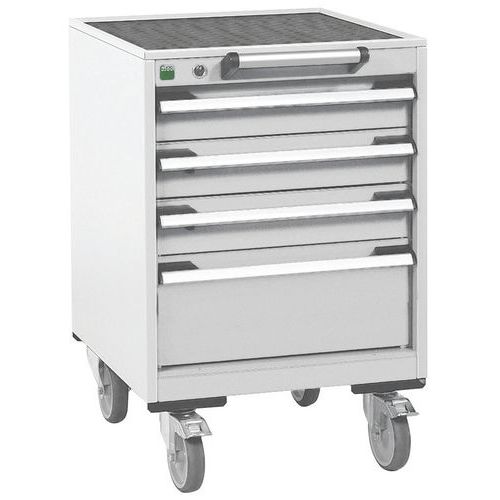 Przenośne szafki z szufladami Bott Cubio z górną powierzchnią roboczą o grubości 2 cm typu multiplex/linoleum lub składaną blachą z matą. Nośność do 300 kg, solidna spawana konstrukcja stalowa, malowana proszkowo. Szuflady z centralnym zamkiem o wysokości 3 x 10 i 1 x 20 cm, nośność 50 kg i 100% wysuwu na łożyskach rolkowych. Ergonomiczne uchwyty do szuflad z listwą opisową, system blokady umożliwiający otwieranie kilku szuflad jednocześnie. Dwa kółka stałe i dwa obrotowe z hamulcem Średnica 12,5 cm. Maks. obciążenie (kg) : 300 kg
