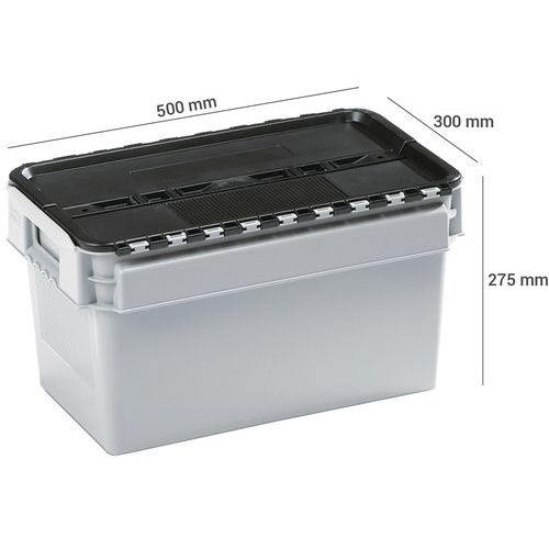 Odpowiednie przenoszenie pudeł na przenośnikach rolkowych. Kontenery można sztaplować i układać w stosy. Proste i szybkie zamykanie. Zawiasy uszczelniające dla efektywniejszego zamykania.