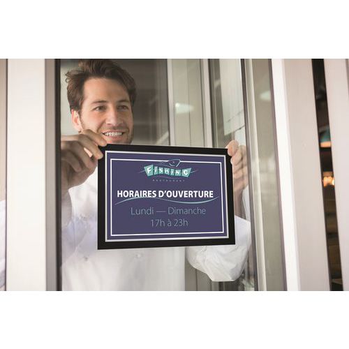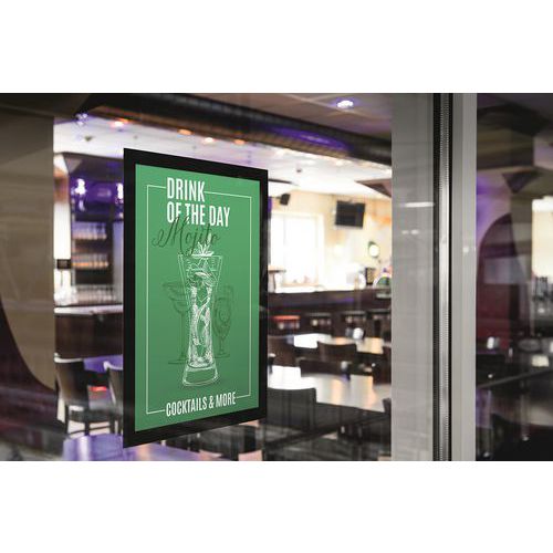 - Dzięki statycznemu mocowaniu ramę można przymocować do gablot, okien, szyb itp.