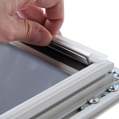 - Plakaty umieszcza się w ramach za pomocą magnetycznego profilu zatrzaskowego.