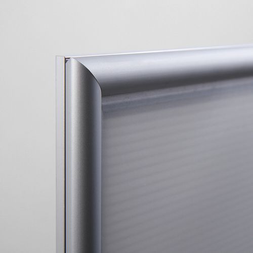 Ramy zatrzaskowe z profilem ramy 15 mm i ostrymi rogami, nadają się do prezentacji ulotek, fotografii, ofert specjalnych itp. Ramy zatrzaskowe są wykonane z anodowanego aluminium oraz folii antyrefleksyjnej z filtrem UV, która chroni przed promieniowaniem UV i ewentualnymi zarysowaniami. Lekkie aluminiowe ramy umożliwiają łatwą manipulację i zapewniają wysoką odporność. Ramy nie obciążają przestrzeni dzięki wykonaniu z cienkiego materiału.