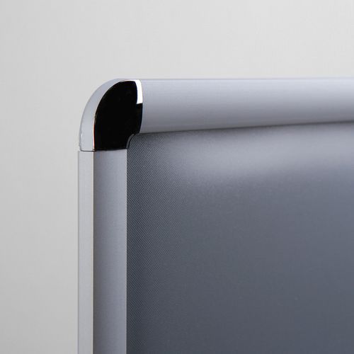 Ramy zatrzaskowe z profilem ramy 20 mm i zaokrąglonymi rogami, nadają się do prezentacji ulotek, fotografii, ofert specjalnych itp. Ramy zatrzaskowe są wykonane z anodowanego aluminium oraz folii antyrefleksyjnej z filtrem UV, która chroni przed promieniowaniem UV i ewentualnymi zarysowaniami. Lekkie aluminiowe ramy umożliwiają łatwą manipulację i zapewniają wysoką odporność. Ramy nie obciążają przestrzeni dzięki wykonaniu z cienkiego materiału.
