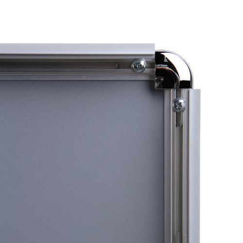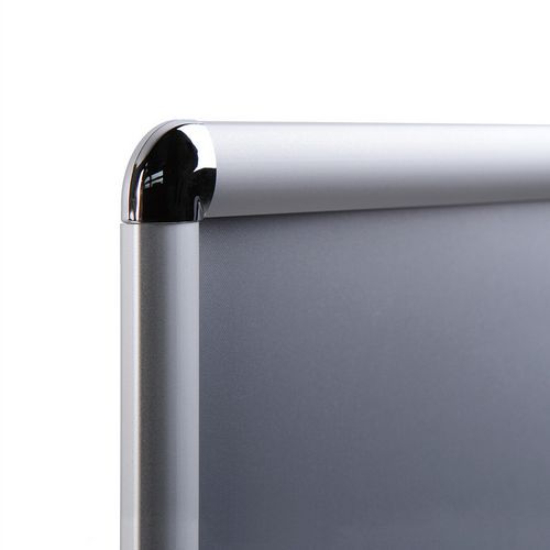 Ramy zatrzaskowe z profilem 25 mm nadają się do prezentacji ulotek, fotografii, ofert specjalnych itp. Szybka i łatwa wymiana zawartości – wystarczy lekko odchylić boczne profile aluminiowe. Ramy zatrzaskowe są wykonane z aluminium z plastikową ścianą tylną oraz folią antyrefleksyjną z filtrem UV, która chroni przed promieniowaniem UV i ewentualnymi zarysowaniami. Ramkę można zawiesić poziomo lub pionowo. Lekkie aluminiowe ramy umożliwiają łatwą manipulację i zapewniają wysoką odporność. Ramy nie obciążają przestrzeni dzięki wykonaniu z cienkiego materiału.