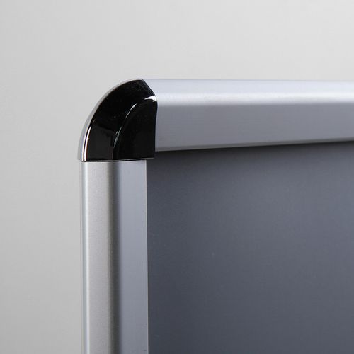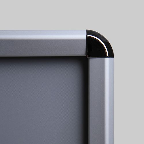 Ramy zatrzaskowe z profilem ramy 32 mm i zaokrąglonymi rogami, nadają się do prezentacji ulotek, fotografii, ofert specjalnych itp. Ramy zatrzaskowe są wykonane z anodowanego aluminium oraz folii antyrefleksyjnej z filtrem UV, która chroni przed promieniowaniem UV i ewentualnym porysowaniem. Lekkie aluminiowe ramy umożliwiają łatwą manipulację i zapewniają wysoką odporność. Ramy nie obciążają przestrzeni dzięki wykonaniu z ultracienkiego materiału.