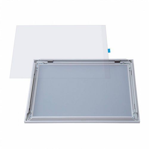 Zewnętrzne ramy zatrzaskowe z designerskim profilem, do umieszczania plakatów, fotografii i reklam. Posiadają folię antyrefleksyjną z ochroną UV. Szybka i łatwa wymiana plakatu – wystarczy lekko odchylić boczne profile aluminiowe. Ściana tylna jest wykonana z szarego tworzywa sztucznego. Możliwość umieszczenia w poziomie lub w pionie.