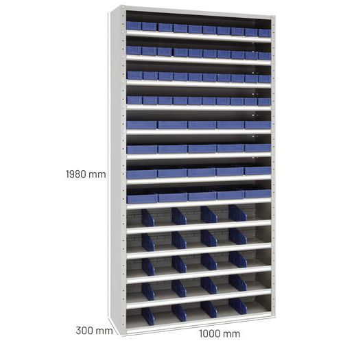 | Nazwa produktu | Regał metalowy z przegrodą i skrzynkami Manutan Expert, 198 x 100 x 30 cm, 12 półek |