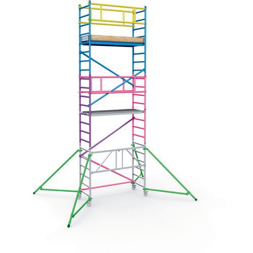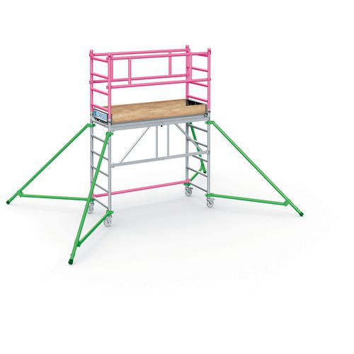 Rusztowanie mobilne w sześciu różnych rozmiarach, zapewnia bezpieczeństwo pracy podczas montażu, naprawach i konserwacji na wysokościach.
