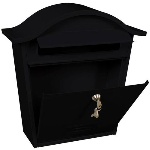 - Naścienna skrzynka na listy z malowanej proszkowo stali ocynkowanej, z zamkiem bębenkowym i uchwytem na małą tabliczkę znamionową.