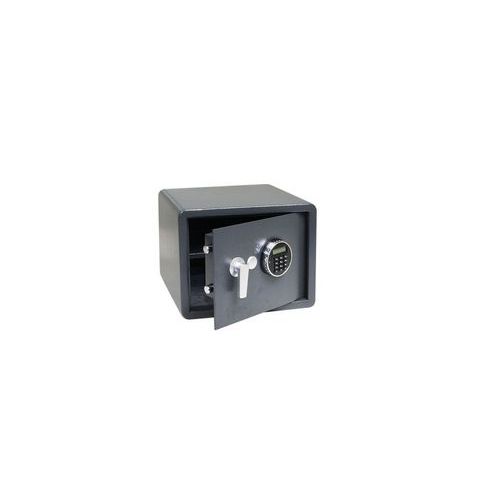 - Sejf stalowy z zamkiem elektronicznym wyposażonym w alarm, podświetlanym wyświetlaczem LCD i dźwignią otwierającą.