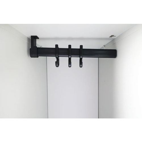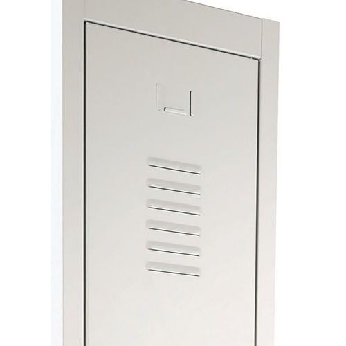 Składana metalowa szafka do szatni zakładowej lub szkolnej. Drzwi skrzydłowe są zawieszone na zawiasach wewnętrznych i można je otwierać w zakresie do 115°. Ciche domykanie dzięki plastikowym ogranicznikom ruchu. Możliwość umieszczenia wizytówki w tabliczce na drzwiach. Kryte perforowane otwory w górnej części drzwi zapewniają cyrkulację powietrza. Półka do odkładania rzeczy w zewnętrznej części szafki, pręt z dwoma haczykami do zawieszania odzieży. Konstrukcja metalowa z blachy stalowej o gr. 0,6 mm. Szafka jest umieszczona na cokole. Zamykane na zamek cylindryczny (w zestawie 2 klucze) lub zamek obrotowy w połączeniu z kłódką (wysokość jarzma 40 mm, średnica jarzma 6 mm).