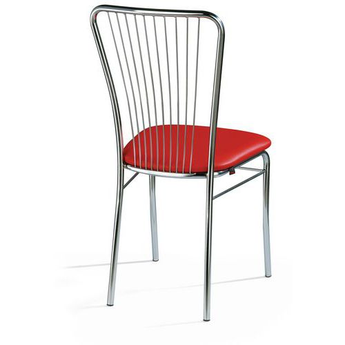 Stylowe krzesło do jadalni składające się z wygodnego siedziska z wysokogatunkowej skóry syntetycznej w trzech wersjach kolorystycznych i wzmocnionej konstrukcji stalowej. Gwarantuje długotrwały estetyczny wygląd osiągnięty dzięki chromowaniu oraz łatwe przechowywanie z uwagi na możliwość układania w stosy. Paczkowane. Nośność tego designerskiego krzesła wynosi 110 kg.