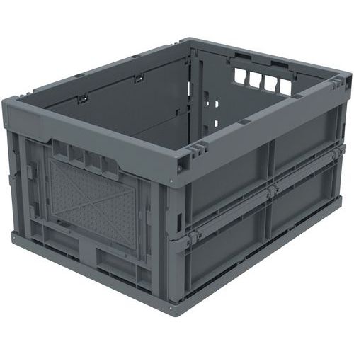 - Solidne składane skrzynki wykonane z polipropylenu pochodzącego z recyklingu, z ergonomicznymi, półotwartymi uchwytami.