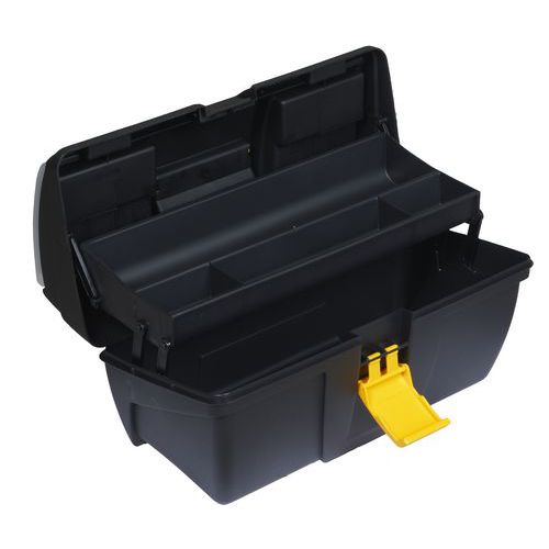 Praktyczna skrzynka na narzędzia, z kilkoma przegródkami. Do przechowywania drobnych elementów lub narzędzi służy wytrzymały organizer umieszczony w górnej osłonie. Na wyposażeniu pojemnika na narzędzia znajduje się praktyczny składany uchwyt. Skrzynkę zamyka się za pomocą plastikowego zamknięcia.