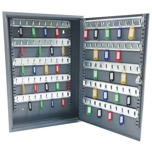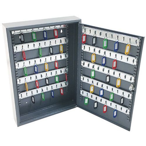 Zamykane skrzynki stalowe o kanciastym kształcie służą do przechowywania 100 kluczy. W zestawie z kolorowymi przywieszkami na klucze.