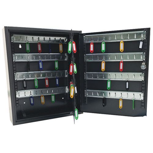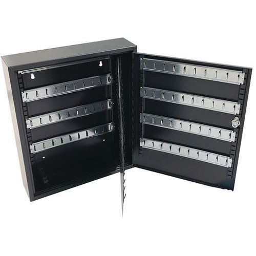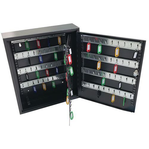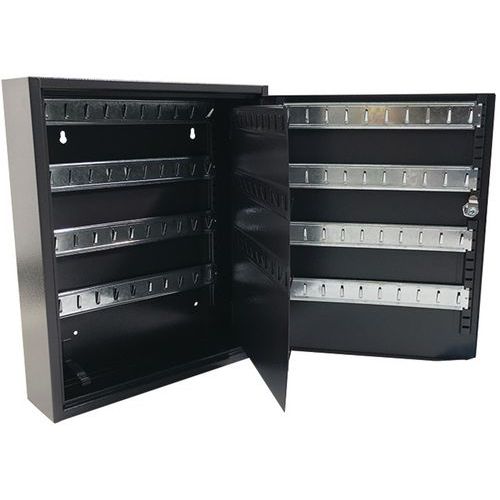 Zamykane skrzynki stalowe o kanciastym kształcie służą do przechowywania 150 kluczy. Skrzynki zawierają jedną przegrodę. W zestawie z kolorowymi przywieszkami na klucze.