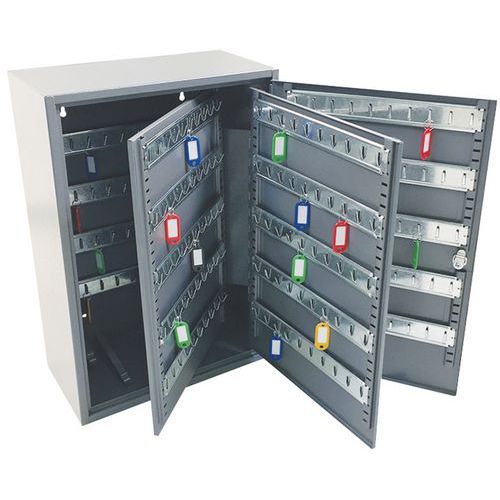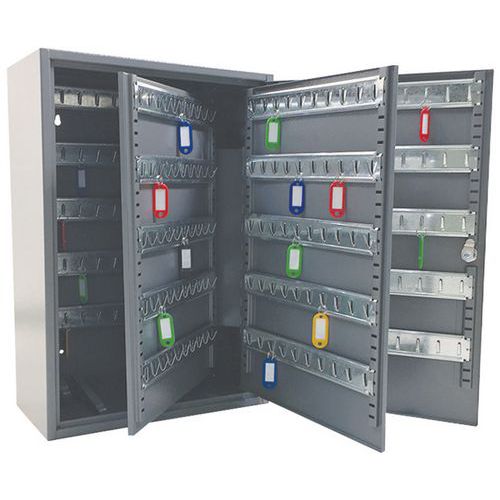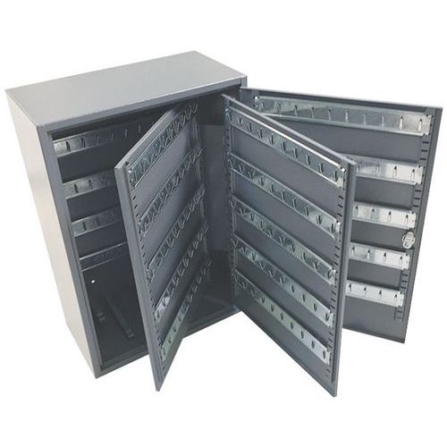Zamykane skrzynki stalowe o kanciastym kształcie służą do przechowywania 300 kluczy. Skrzynki zawierają dwie przegrody. W zestawie z kolorowymi przywieszkami na klucze.