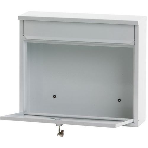 - Metalowa skrzynka na listy montowana na ścianie z klapką i zamykanymi przednimi drzwiami wejściowymi.