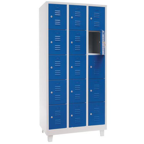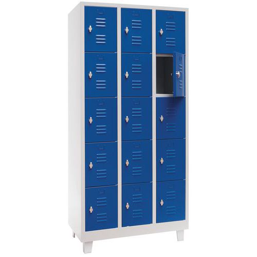 | Nazwa produktu | Spawana szafka szatniowa Manutan Expert Antohny na nóżkach, 15 boksów, bez zamka, szary/niebieski |