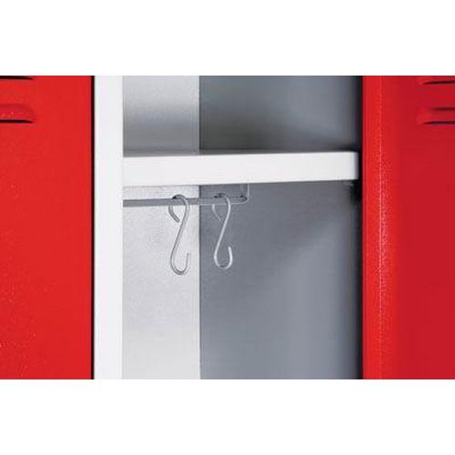 W zestawie znajduje się półka, pręt na wieszaki i 2 haczyki na odzież. W zestawie z dwoma kluczami do każdego przedziału.