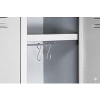 W zestawie znajduje się półka, pręt na wieszaki i 2 haczyki na odzież. W zestawie z dwoma kluczami do każdego przedziału.