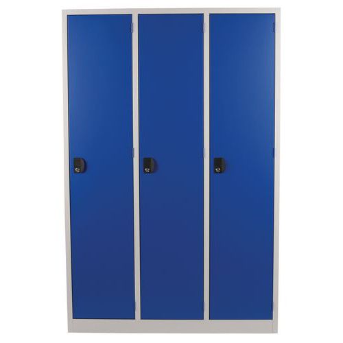 Spawana szafka szatniowa Manutan Expert, 3 przedziały, zamek cylindryczny, szary/niebieski