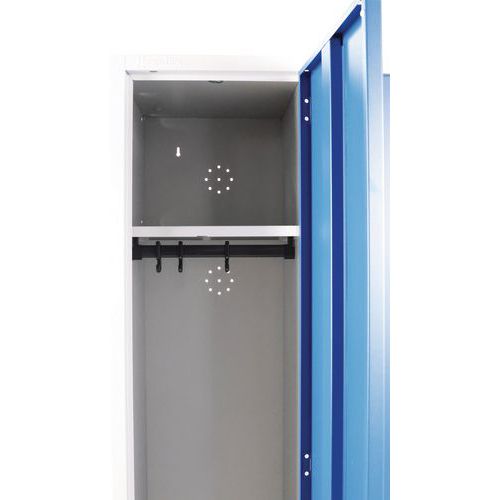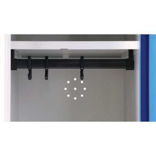 W zestawie znajduje się półka, pręt na wieszaki i haczyk na odzież. W zestawie z dwoma kluczami do każdego boksu.
